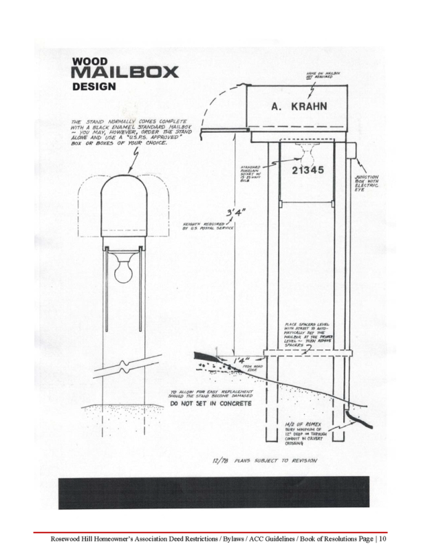 Mailboxes are required to be uniform in design as approved by the ACC and may be constructed of wood, brick or stone. All mailboxes must have a lighted address on both sides. The ACC has adopted the standard mailbox below that may be installed without approval, but ANY deviation from this design must receive ACC approval prior to install. Follow the instructions below the image.